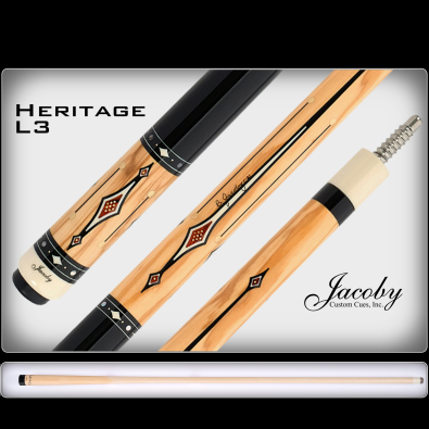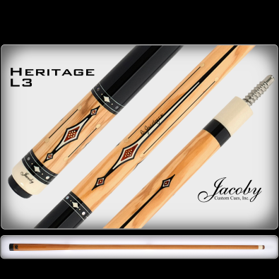 The Heritage L3 Cue is crafted with Mediterranean Olivewood and Ebonized Maple. The L3 Cue is embellished with accenting inlays and rings. The forearm and butt sleeve are made from Mediterranean Olivewood. Ebonized Maple makes up the wrap section of this cue. The solid black appearance gives the L3 a bold looking wrap section. There are twelve White Juma Tiffany Diamonds, twelve Abalone circles, one hundred twelve Jewelers Bronze circles, twenty-four Black Juma and Jewelers Bronze dumbbells, sixteen White Juma spear trim, and sixteen White and Black Juma points. Giving this cue a total of two hundred sixteen hand-placed inlays and seventeen accenting rings. This cue is complete with a radial pin and a 12.7MM Ultra Pro Shaft.