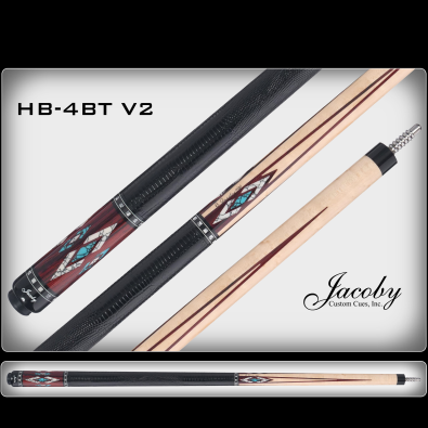 The HB4-BT V2 is created with BirdsEye Maple, Cocobolo, with accenting White Buffalo Turquoise and Turquoise Inlays. The rare BirdsEye Maple makes up the forearm of this cue. Native to the Canadian Regions and Eastern USA. The eye-like wood grain defines the BirdsEye look and name. The HB4-BT V2’s leather wrap section is a Black Emobossed Italian Lizard. The butt sleeve is composed of Cocobolo wood. Finishing the unique design of this cue is the Thirty-six White Buffalo Turquoise index stitches, four cocobolo points, and thirty-six White Buffalo Turquoise/Turquoise inlays all hand placed in this cue. The HB4-T comes complete with a Radial Pin and comes standard with one Jacoby Ultra Pro Shaft.